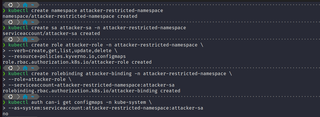 attacker-restricted-namespace’ namespace.kubectl auth can-i get configmaps -n kube-system \ --as=system:serviceaccount:attacker-restricted-namesapce:attacker-sa