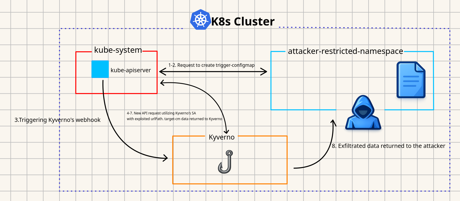 trigger-configmap.yaml.kube-apiserver authenticates and authorizes the request to create trigger-configmap in ‘attacker-restricted-namespace’ (utilizing attacker ServiceAccount).kube-apiserver calls Kyverno webhook service.apiCall urlPath. The resolved urlPath value is now : /api/v1/namespace/kube-system/configmaps/target-cm.kube-system namespace, which is returned to the attacker.